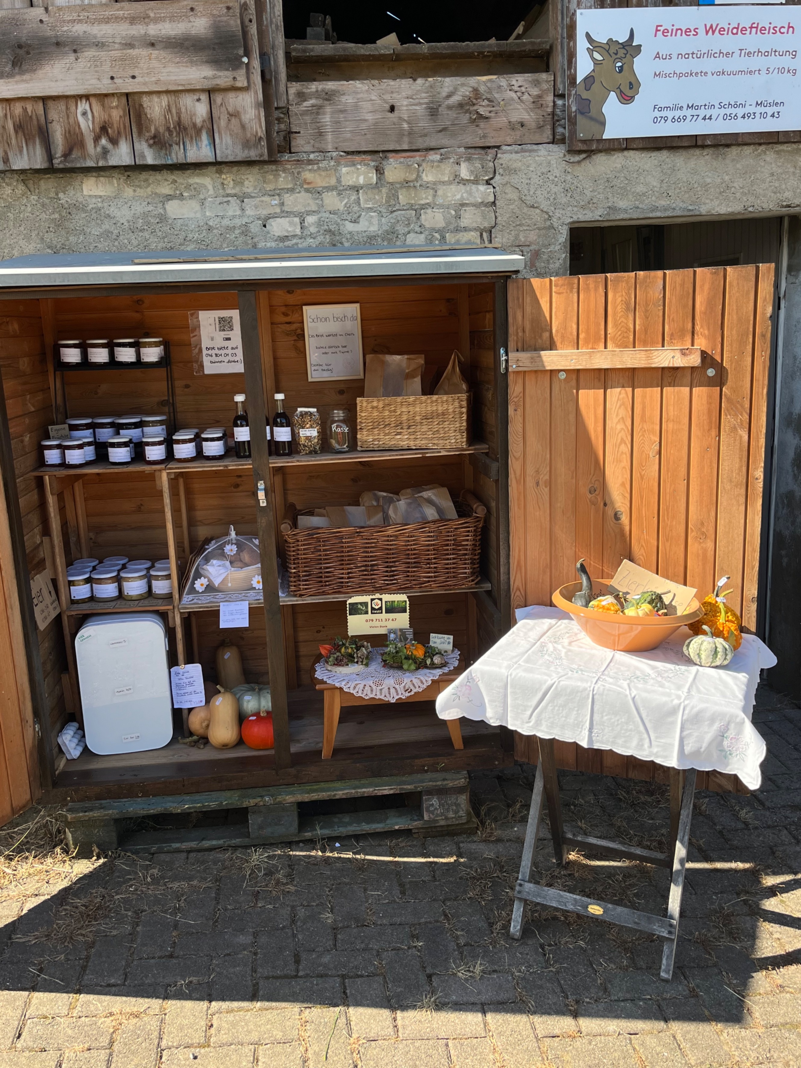 Ausserdem erhältlich sind Eier von unseren Hühnern, Alpkäse von Berufskolleg*innen, Kürbisse und jeden Samstag leckeres Sauerteigbrot und Dinkelzöpfe.